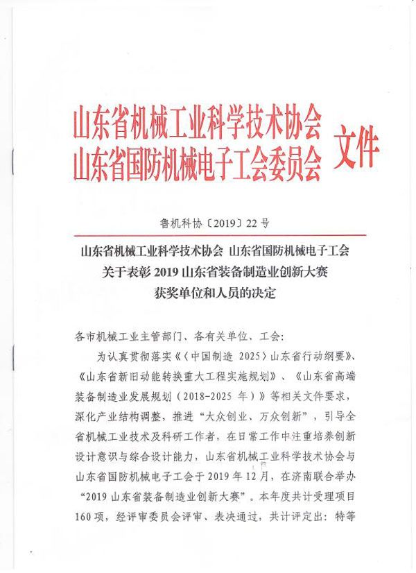 公司榮獲山東省裝備制造業(yè)創(chuàng)新大賽二等獎